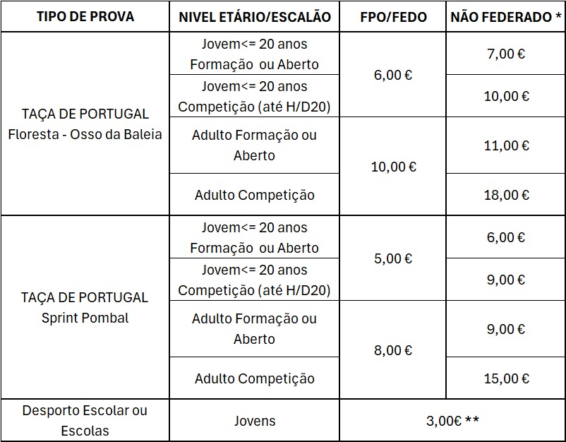 Nota: Nos escalões Abertos os participantes podem efectuar a prova a sós ou em grupo. No entanto, mesmo quando a participar em grupo, cada pessoa paga a sua inscrição, uma vez que está coberto pela apólice de seguro de não federado, tem direito ao seu mapa e à sua classificação.